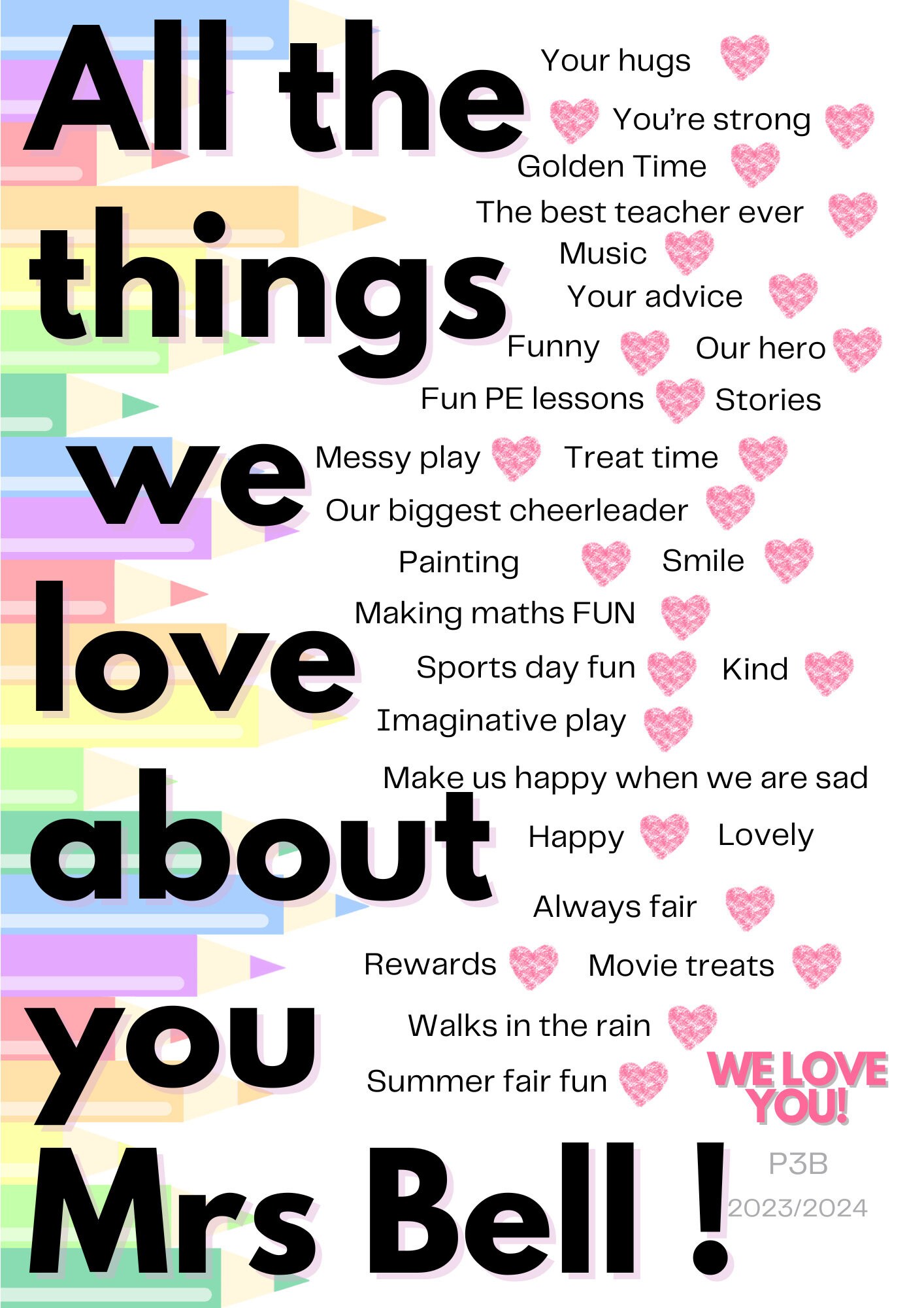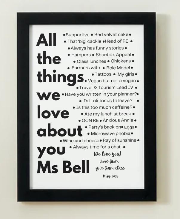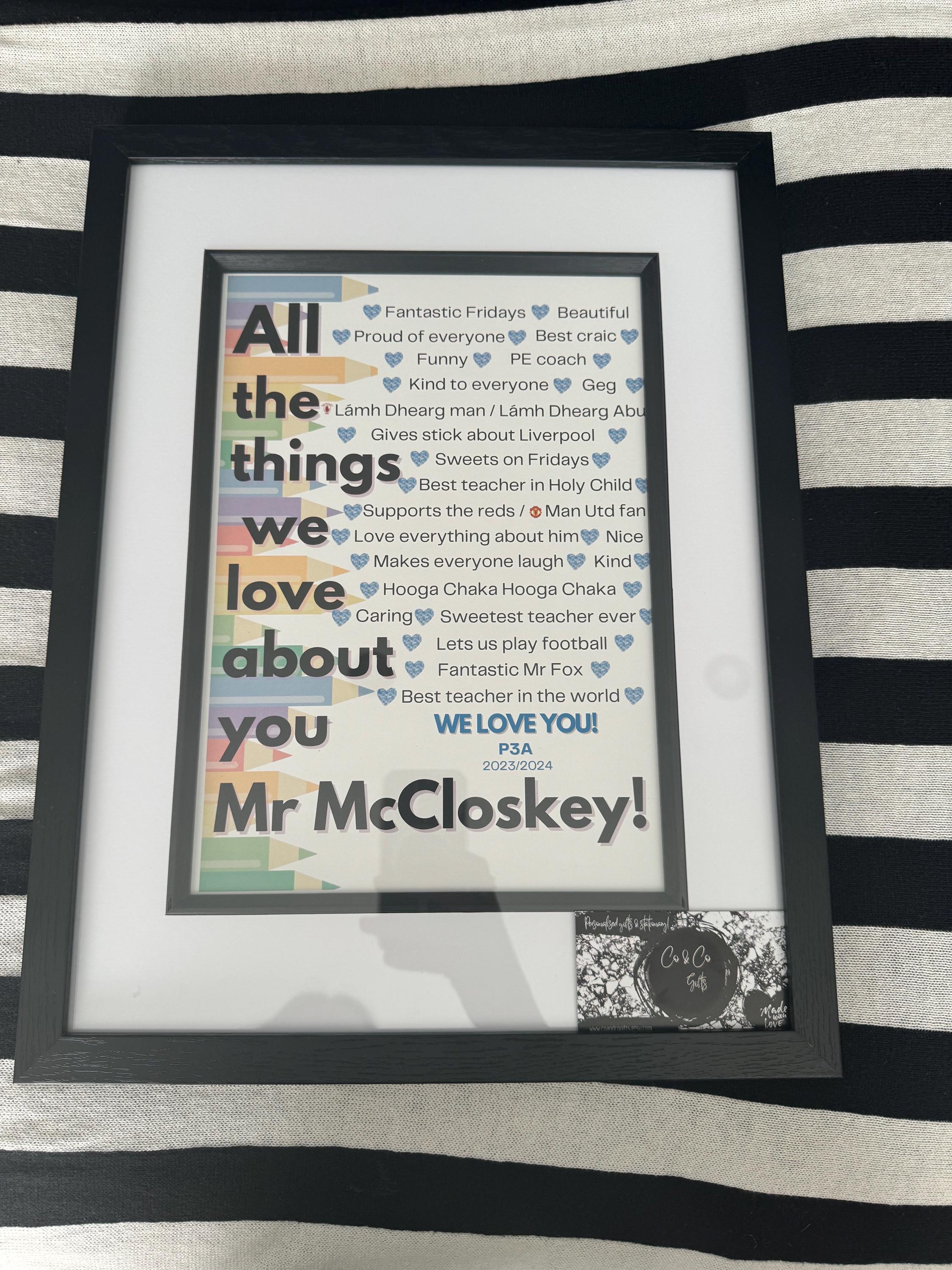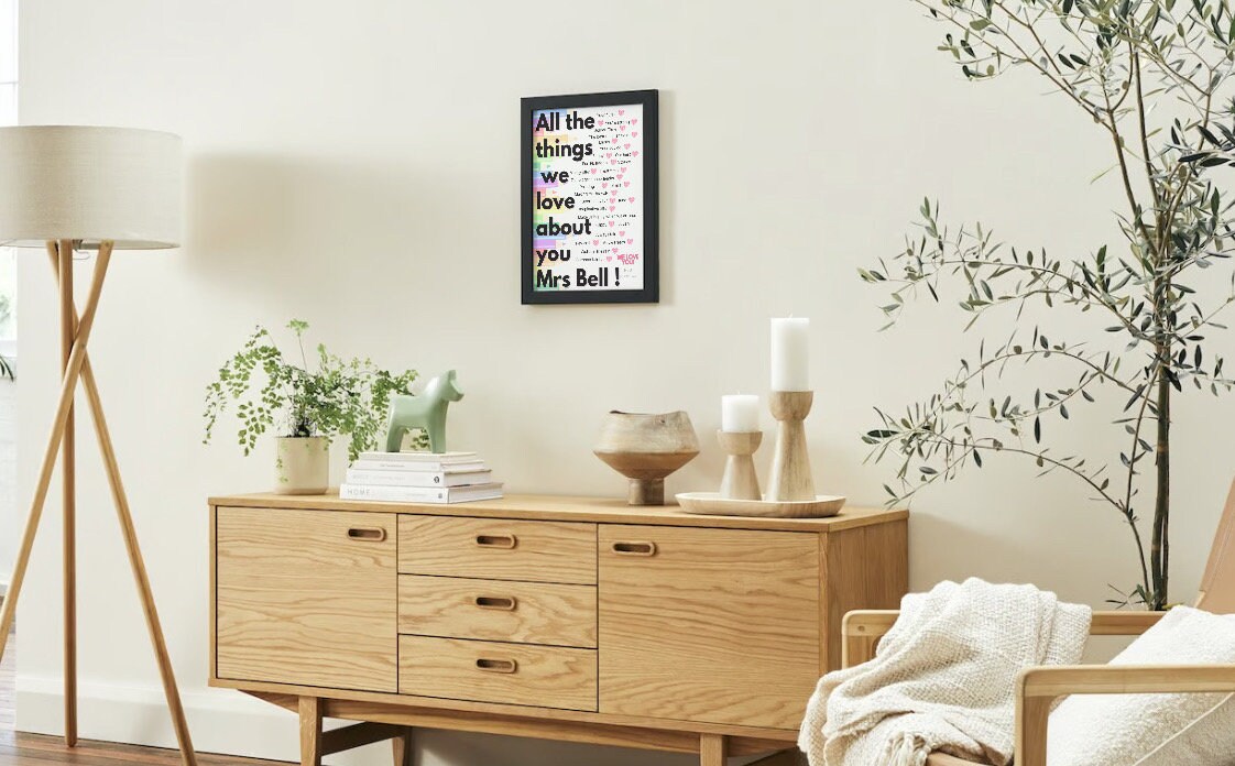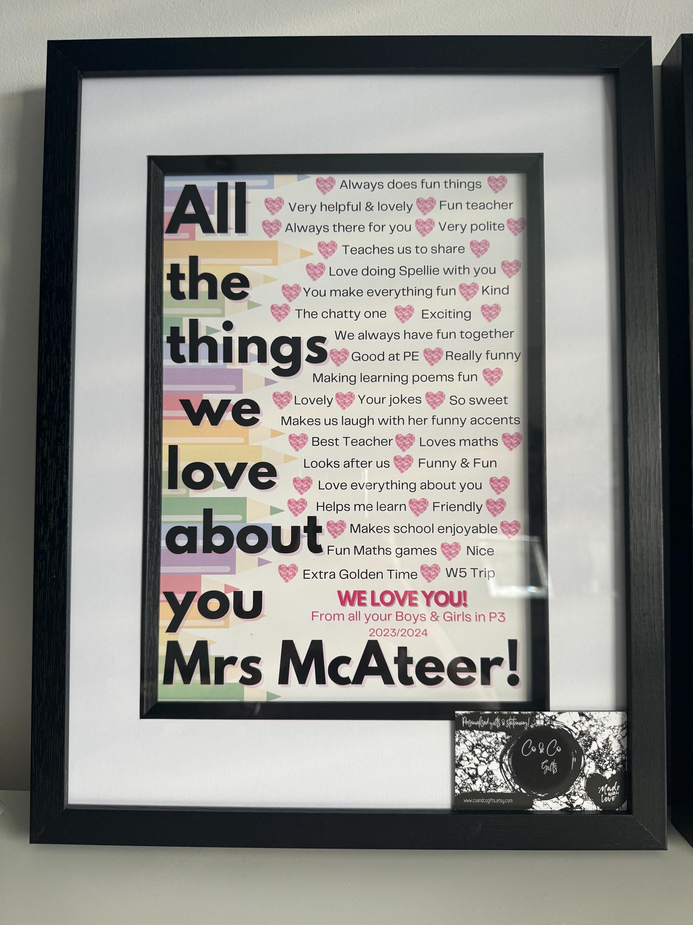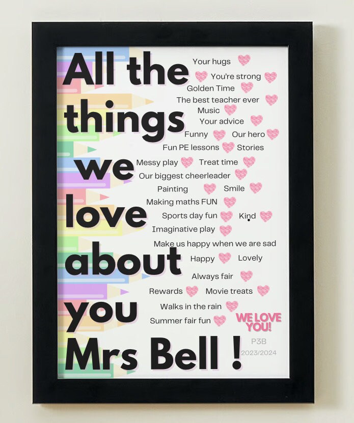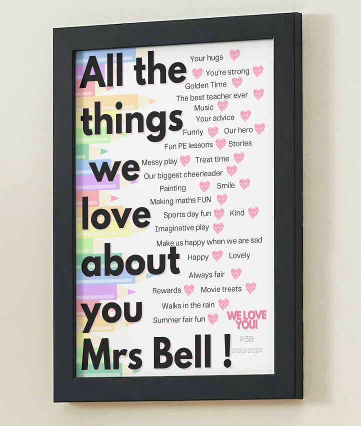Made to Order Print.Every pupil can add one thing they love about their teacher/classroom assistant*Send list of things you want included.Can be printed and framed if required at an additional cost.A4 in 16x12" Black frame