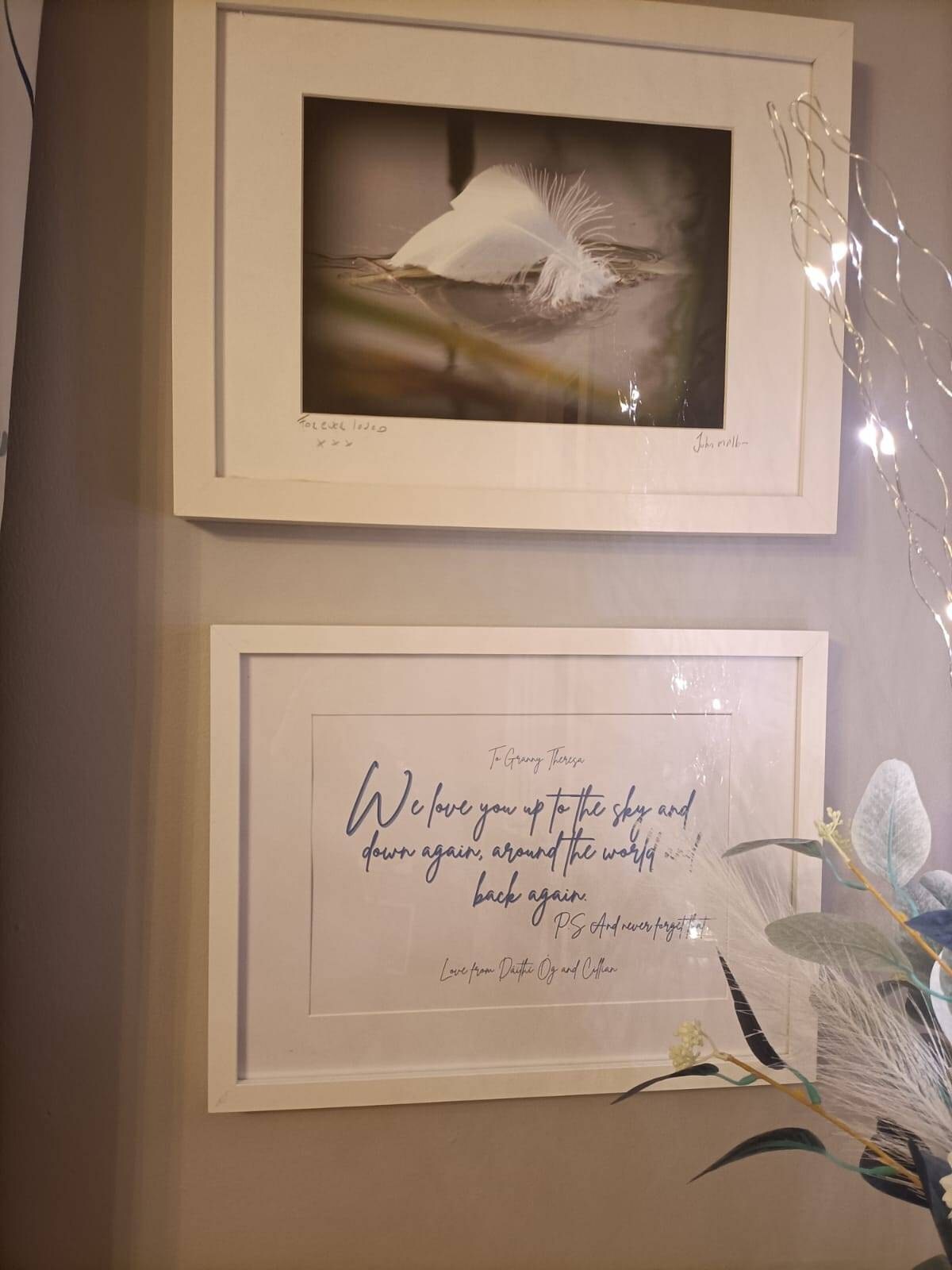 Select colour of text (Black, Pink, Blue, Beige, Grey…. any additional colours on request) and colour of frame (White, Grey, Black)